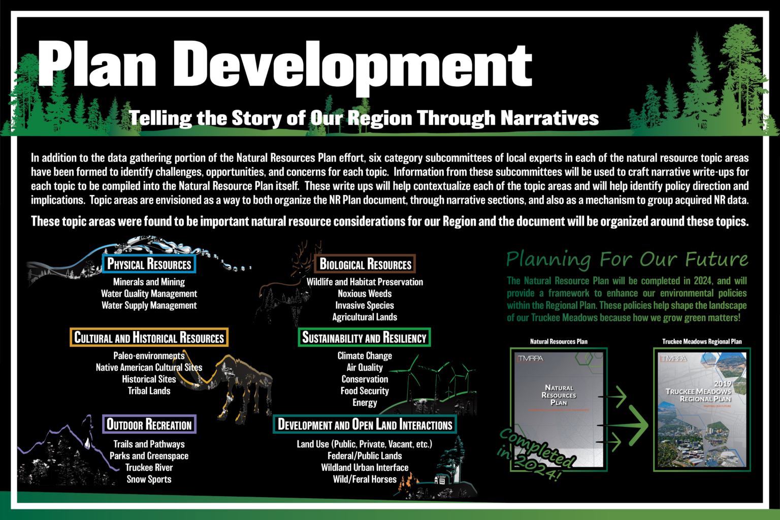 In 2019 the latest update to the Truckee Meadows Regional Plan was adopted. As part of the 2019 Truckee Meadows Regional Plan, a policy was adopted stating that “TMRPA will facilitate a cooperative approach to developing a plan that addresses natural resources regionally, by working in conjunction with regional partners and the wider region. As part of this natural resources plan a map will be created identifying various natural resource areas that should be protected.” In addition, Nevada Revised Statutes 278.0274 subsection 2, requires that the Regional Plan include goals, policies, maps and other documents relating to, “Conservation, including policies relating to the use and protection of air, land, water and other natural resources, ambient air quality, natural recharge areas, floodplains and wetlands, and a map showing the areas that are best suited for development based on those policies.”