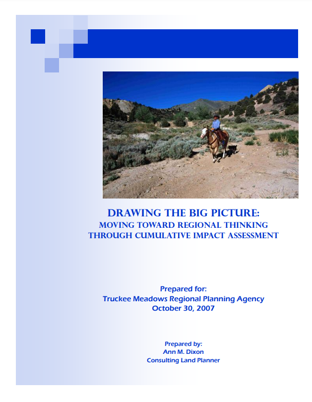 The purpose of this study was to conduct research into examples of cumulative impact evaluation as conducted by several such agencies in other regions, in order to compare methods, procedures, and principles with those of the TMRPA. This report describes several approaches for obtaining data on cumulative impacts and provides an assessment of these processes, identifying elements that contribute to or hinder the success of the process in other jurisdictions. This report includes discussion of ways cumulative development impacts may be categorized, which impacts are most readily evaluated, how impacts are being measured and quantified in other communities, and how this information is used to inform planning and development decisions and policies.