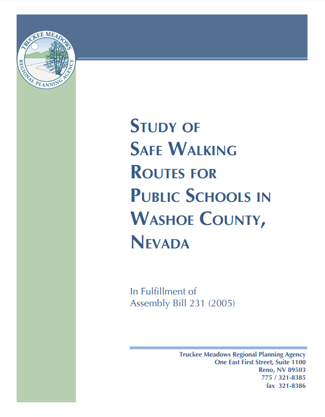 This study responds to Assembly Bill 231 (AB 231), passed during the 73rd Session of the Nevada Legislature, approved by the Governor May 24, 2005, and effective July 1, 2005. In Washoe County, it is the Truckee Meadows Regional Planning Commission (RPC) that was required to coordinate and submit this study to the Director of the Legislative Counsel Bureau for transmittal to the 74th Session of the Nevada Legislature. Specifically, the study includes: a) A review and evaluation of the existing walking paths and sidewalks within a 1-mile radius of each public school located in the county; b) Recommendations for improvements to the conditions of those walking paths and sidewalks; and c) A review and evaluation of the programs currently implemented in the county to ensure safe walking routes for pupils to schools.