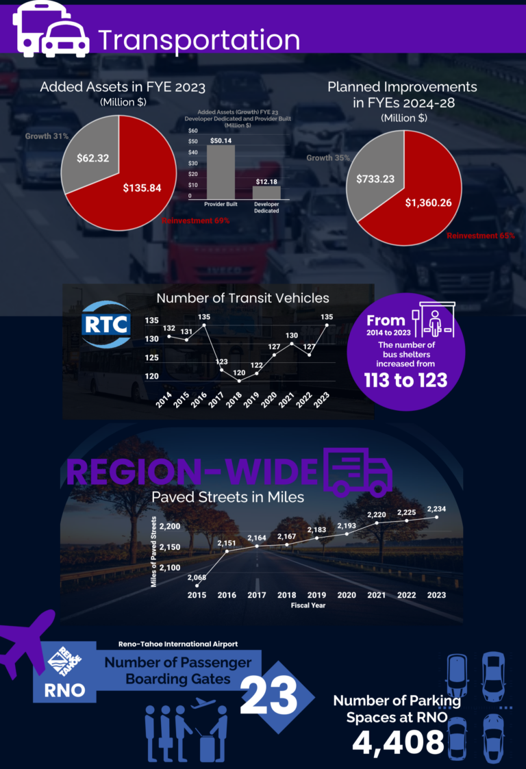 Per Nevada Revised Statutes (NRS 278.0274) TMRPA is required to summarize the capital improvement programs for five facility and service domains across the Region. The dashboard statistics represent the collaborative efforts of staff from TMRPA, the jurisdictions, and affected entities to provide a regional level synthesis of this information.