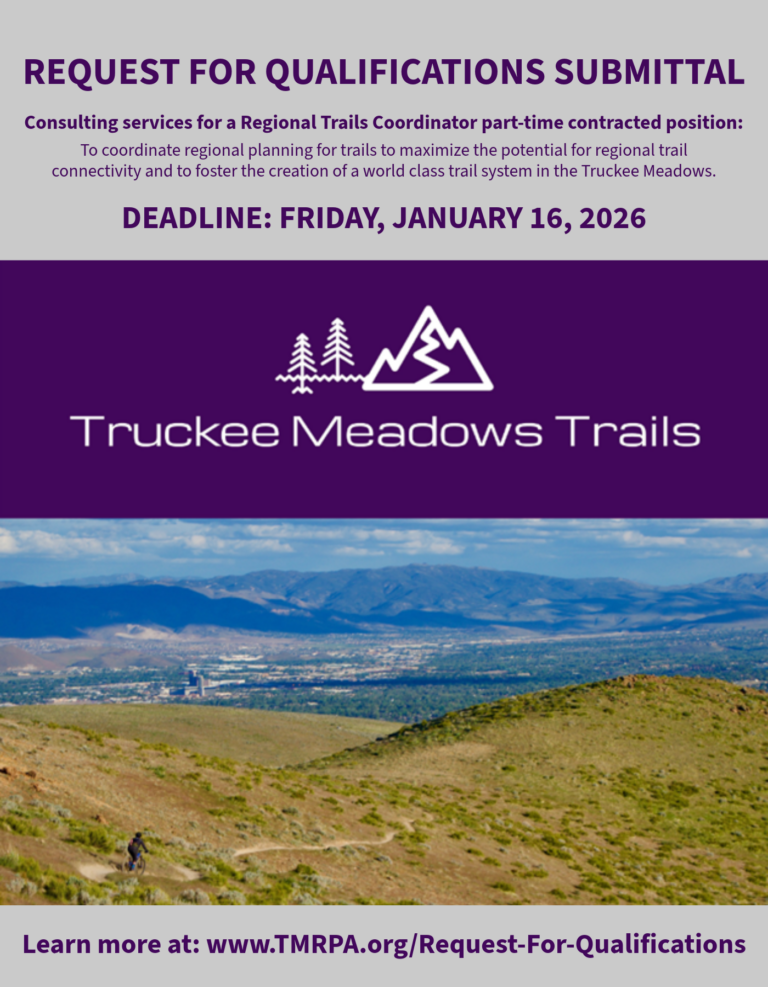 The primary responsibility of the Regional Trails Coordinator will be to implement the TMT trails plan under the guidance of the TMT Working Group. Implementation includes working with government land/recreation management agencies at the federal, state, and local level and with local non-profits, volunteers, and other entities interested in trails. The work plan (i.e., “scope of work) will be developed by the TMT Working Group, TMRPA staff, and the selected consultant to coordinate funding, planning, construction, and maintenance priorities. The responsibilities include working with local political entities and the general public to build and enhance support for trails. One major priority is to work with jurisdiction planning departments to identify and promote trails as an integral part of planning for growth in the Truckee Meadows. To ensure successful implementation of the TMT plan, the selected consultant will need to identify and acquire a variety of ongoing funding sources to support planning, construction, and maintenance of trails, as well as the position itself.